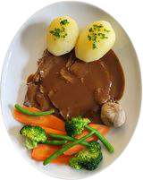 Alle hovedretter serveres med grønnsaker og kokte poteter.